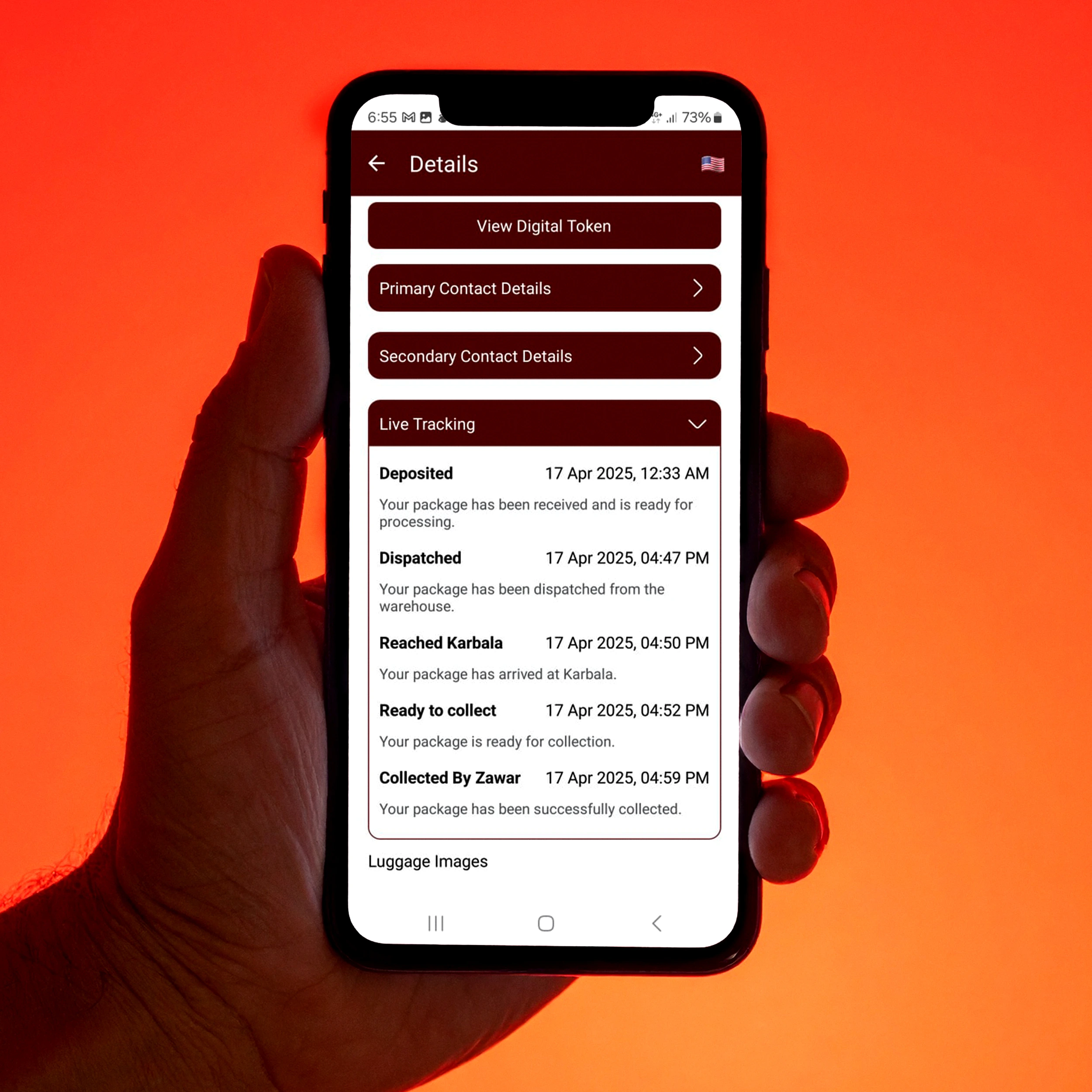 Dive into a detailed timeline showing your luggage’s movement: Deposited → Dispatched → Reached Karbala → Ready to Collect → Collected by Zawar. A digital token ensures smooth verification and collection.