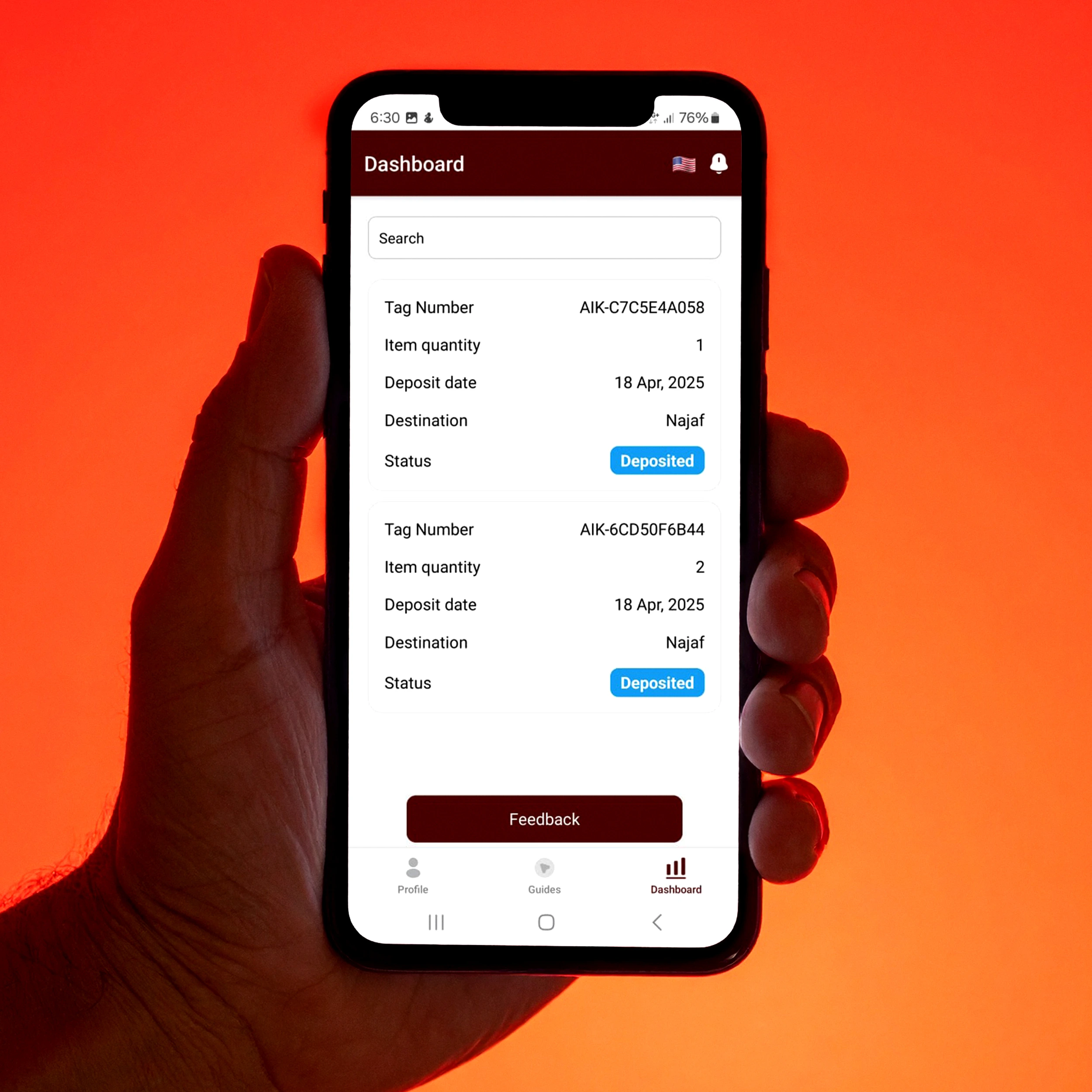 Travel with peace of mind knowing your luggage and journey are being tracked every step of the way. The Just Hussain App brings together real-time tracking, secure storage, and guided navigation — all in one place. Whether you’re depositing your belongings in Najaf or collecting them in Karbala, you’ll receive instant updates, clear location guides, and a digital token for quick verification. No queues, no confusion — just a smooth, transparent experience designed for Zawars.